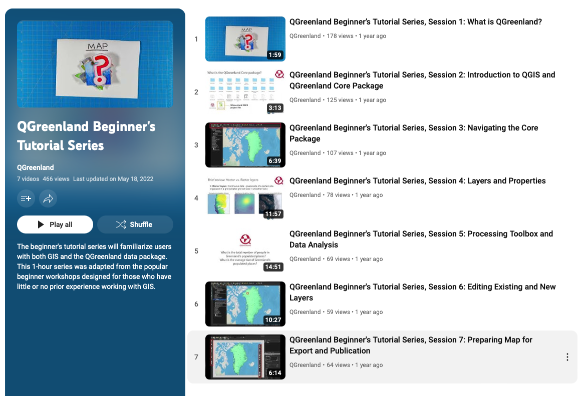 In this video series, you will become familiar with QGIS, learn how to download and browse the QGreenland Core data package, and explore the basic geospatial data anlysis tools that make QGreenland a powerful tool for research, education, and local decision making. The video tutorial series contains 7 short video sessions, for a total of one-hour.